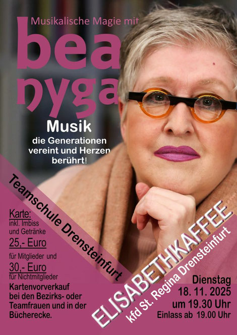 Der Elisabethkaffee verspricht jedoch ein unvergessliches Erlebnis zu werden. Freuen Sie sich auf einen Abend voller Musik mit der talentierten Interpretin Bea Nyga, die Sie mit ihren Klängen verzaubern wird. Die gebürtige Münsteranerin ist leidenschaftliche Musikerin und Weltenbummlerin.